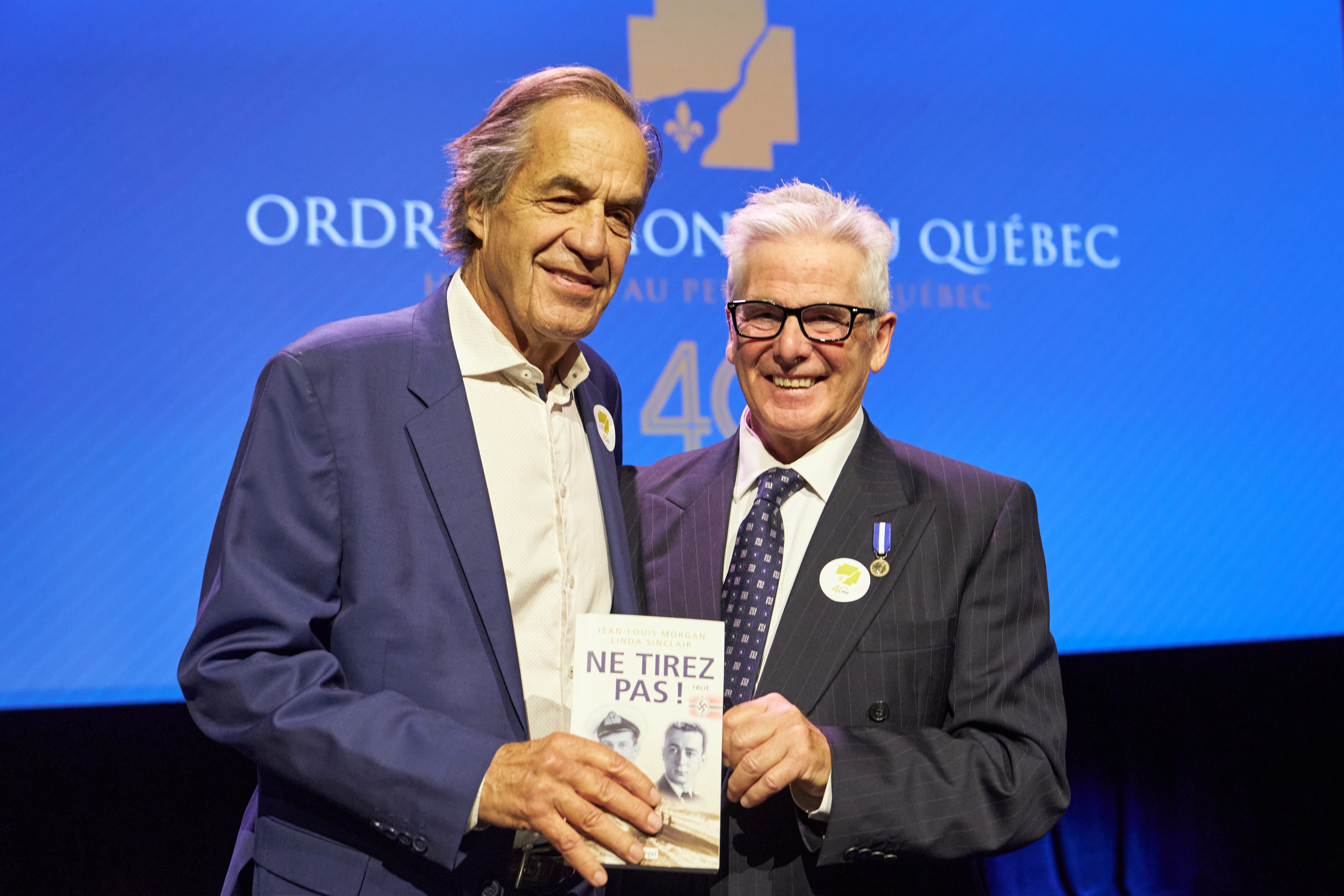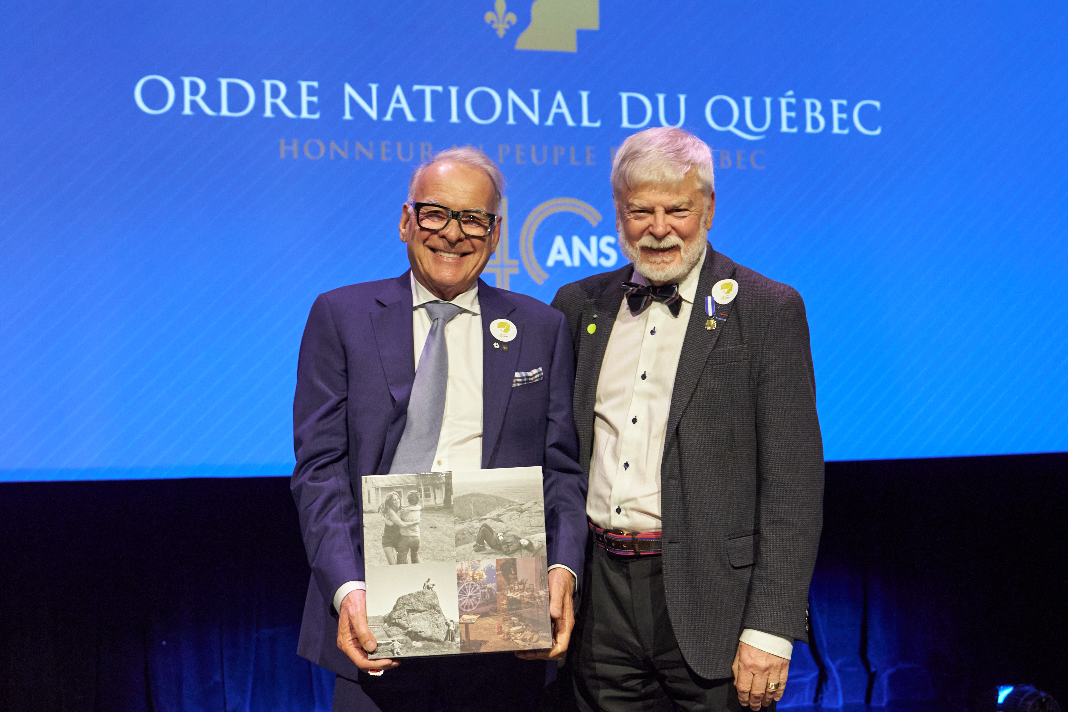 Alain Bouchard, O.Q., à gauche, est reparti avec un exemplaire du livre de photographies de Jacques Payette, rédigé et offert par John R. Porter, O.Q.